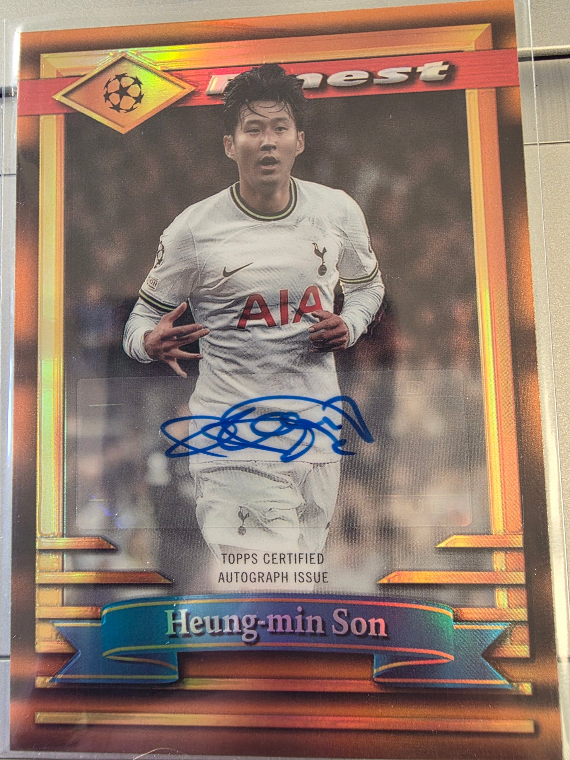 This limited-edition Heung-min Son Topps Finest UEFA Champions League autographed gold card, numbered 05/10, features an on-card signature, making it a rare collector’s piece. Celebrating Son’s elite performance on the European stage, this card combines premium design with exclusive authentication, perfect for serious collectors seeking a unique addition that highlights his impact in Champions League history.